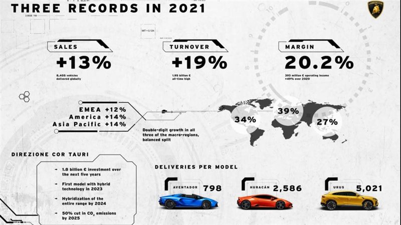 وتم تسليم 8405 سيارات على الصعيد الدولي، وبالإجمال، فإن المناطق الكبرى التي شهدت فيها لامبورجيني نموا بأرقام مزدوجة هي أمريكا (14+٪)، آسيا الباسيفيك (14+٪) وأوروبا، الشرق الأوسط وأفريقيا (12+٪)، حيث إن نِسَب 34٪، 27٪ و39٪ من الأحجام الدولية، على التوالي، تنقسم بشكل متساو، وكانت الطرازات الأكثر تحقيقا للنتائج، لامبورجيني أورورس وهي سيارة رياضية متعدّدة الاستعمالات (SUV) لاقت نجاحًا كبيرًا مع تسليم 5،021 سيارة منها، وتبعتها سيارة هوراكان بمحرك V10 والتي شهدت زيادة عالية في المبيعات وصلت إلى 2،586 سيارة، مرتكِزة على الزخم القوي الذي ولدته سيارة هوراكان STO، إضافة لهذا، تم تسليم 798 سيارة من طراز ’أفنتادور‘ (Aventador) حول العالم، كما ستقوم لامبورجيني خلال الشهور القادمة بإزاحة الستار عن ابتكارات خاصة بطرازي هوراكان وأوروس، مع ظهور اثنين لكل طراز، ليتم من بعدها إنهاء عصر محرّكات الاحتراق الداخلي والانتقال إلى الطرازات الهجينة، والتي تبدأ مع وصول الطراز الذي يحلّ مكان أفنتادور في 2023.