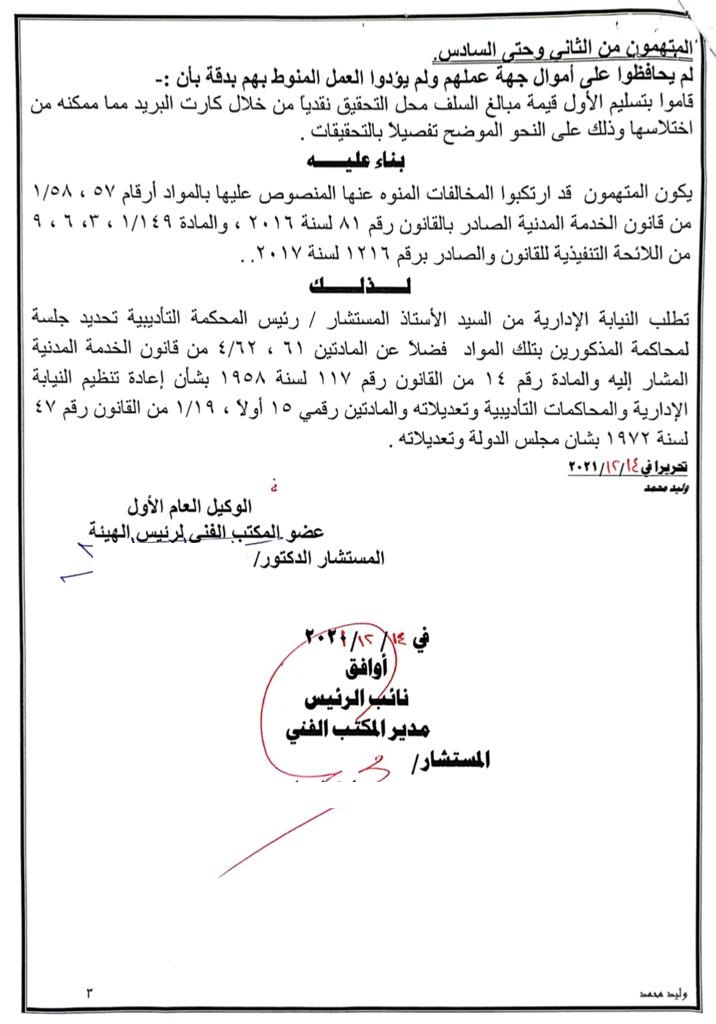 وطلبت النيابة الإدارية من رئيس المحكمة تحديد أقرب جلسة لنظر القضية ومحاكمة المحالين تأديبيًا طبقًا لنصوص المواد 57 ـ 58/1 ـ 61 ـ 62 من قانون الخدمة المدنية رقم 81 لسنة 2016، والمواد أرقام 149/1 ـ 3 ـ 6 ـ 9، من اللائحة التنفيذية للقانون والمادة 14 من القانون رقم 117 لسنة 1958 بإعادة تنظيم النيابة الإدارية والمحاكمات التأديبية، وبالمادتين 15 أولًا و19/1 من قانون مجلس الدولة.