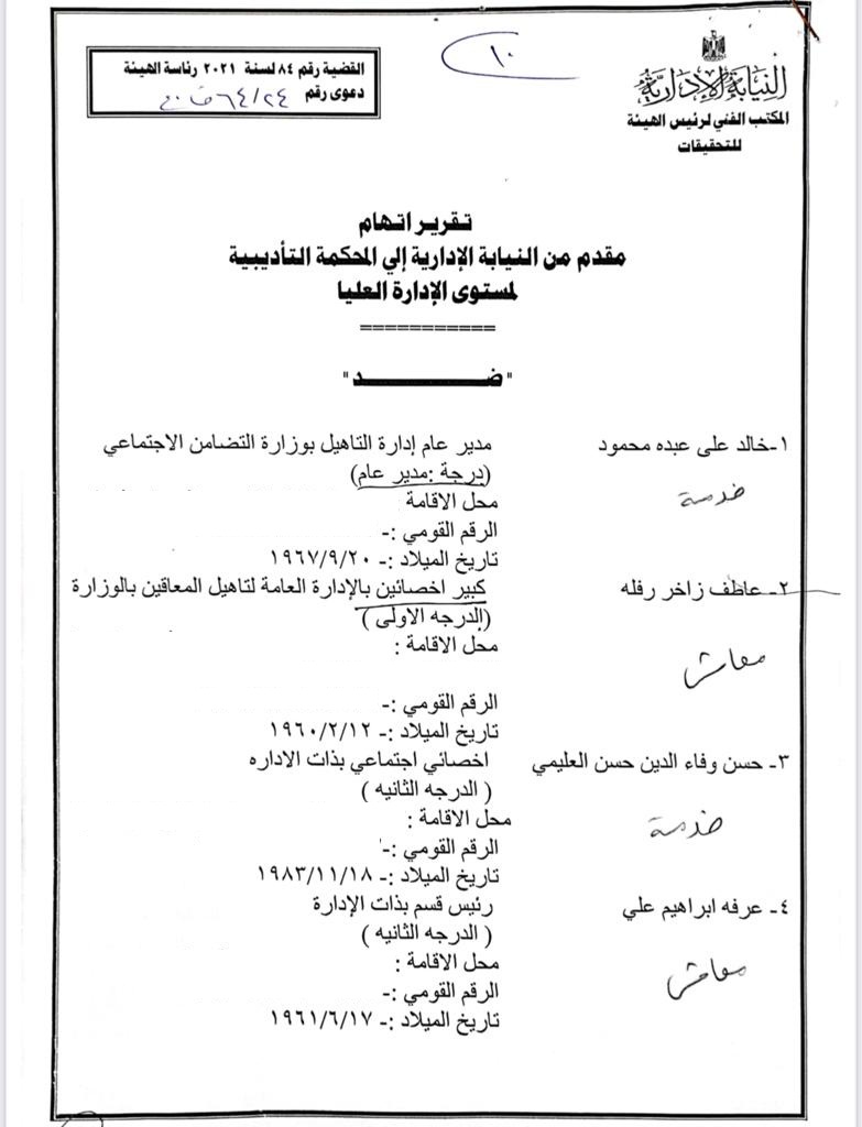 وأكدت النيابة الإدارية أن عاطف زاخر رفلة، كبير أخصائيين بالإدارة العامة لتأهيل المعاقين بوزارة التضامن الاجتماعي وحسن وفاء العليمي، أخصائي اجتماعي بذات الإدارة وعرفة إبراهيم علي، رئيس قسم ونجيب محمد إسماعيل، سكرتير وأحمد شعبان علي، أخصائي اجتماعي لم يحافظوا على أموال جهة عملهم ولم يؤدوا العمل المنوط بهم بدقة بأن قاموا بتسليم المتهم الأول قيمة مبالغ السلف نقدًا من خلال كارت البريد مما مكنه من اختلاسها لنفسه، وانتهت التحقيقات إلى إحالة المتهمين الستة للمحاكمة.