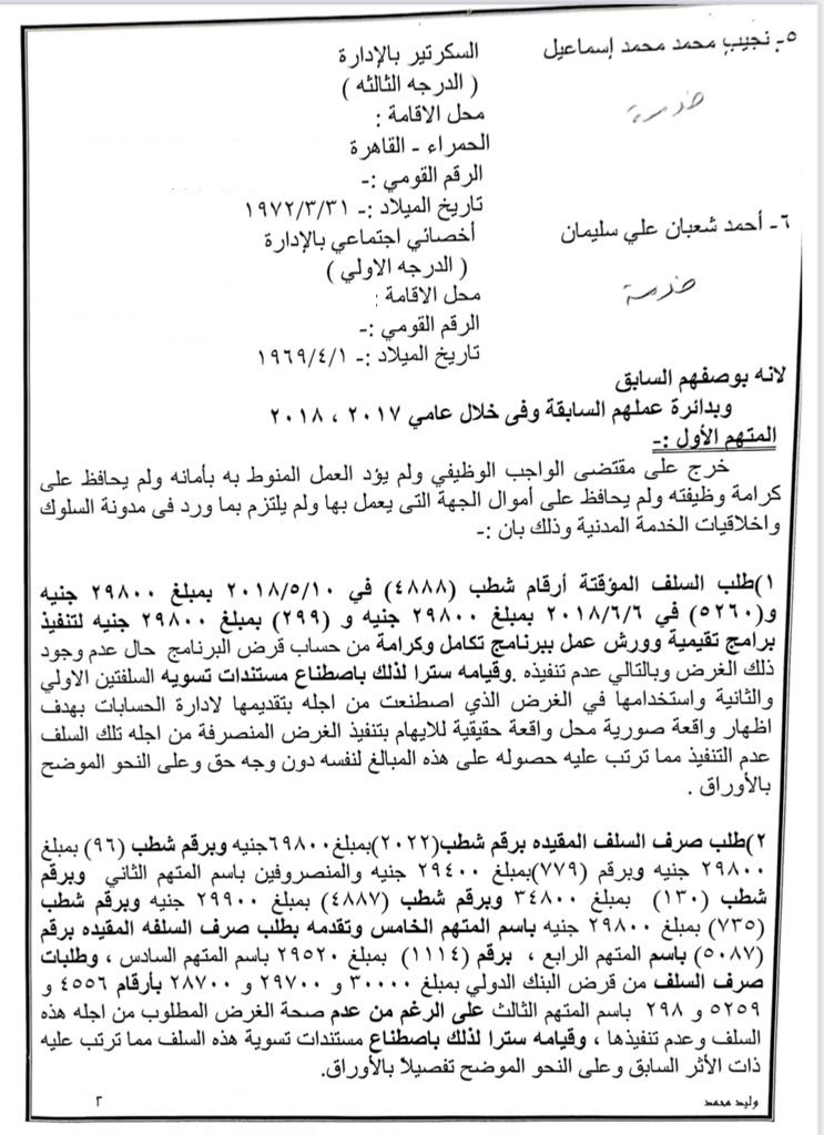 وجاء بأوراق القضية أن المتهم طلب صرف السلف المقيدة بأرقام شطب 2022 بمبلغ 69800 جنيه و69 بمبلغ 29800 جنيه و779 بمبلغ 29400 جنيه والمنصرفين بإسم المتهم الثاني عاطف زاخر رفلة، وبرقم شطب 130 بمبلغ 34800 جنيه وبرقم شطب 4887 بمبلغ 29900 جنيه وبرقم شطب 735 بمبلغ 29800 جنيه باسم المتهم الخامس نجيب محمد إسماعيل.