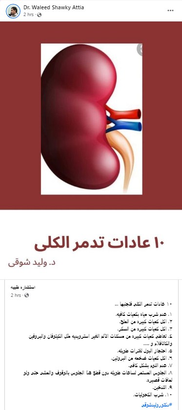 وكتب وليد شوقي تدوينة على الفيس بوك قال فيها:١٠ عادات تدمر الكلى فتجنبها وهي: