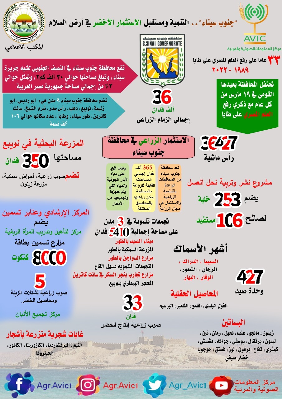 نشر مركز المعلومات الصوتية والمرئية بوزارة الزراعة واستصلاح الأراضي، انفوجراف جديد، بمناسبة احتفال محافظة جنوب سيناء بعيدها القومي بعنوان: "جنوب سيناء".. التنمية ومستقبل الاستثمار الأخضر في أرض السلام