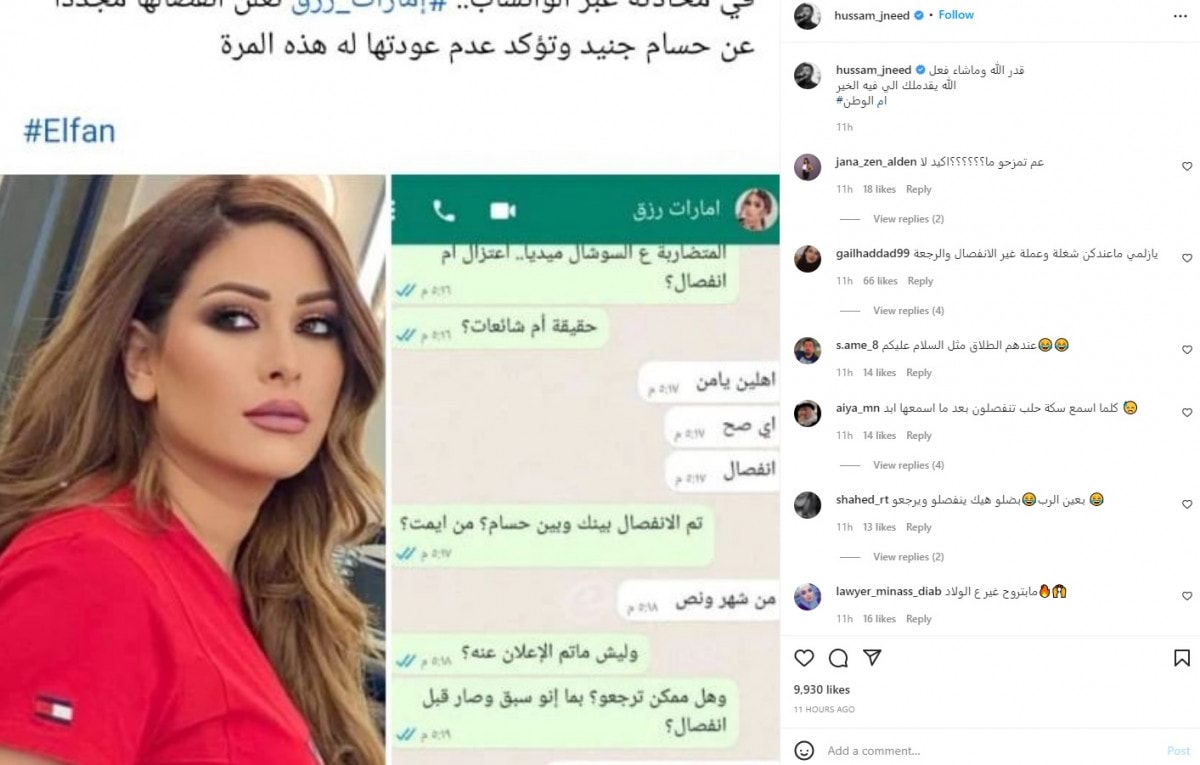وكتبت إمارات رزق، قائلة: ”أبغض الحلال عند الله الطلاق، بس تم بيني وبين حسام، بتمنى التوفيق لأبو وطن وإن شاء الله تكون الحياة الجاية أحسن إلي وإلو، بتمنى بعد هالبوست ما يصير أي أسئلة أو تعليقات عن هالموضوع، واللي بيجي من الله يا محلاه“.