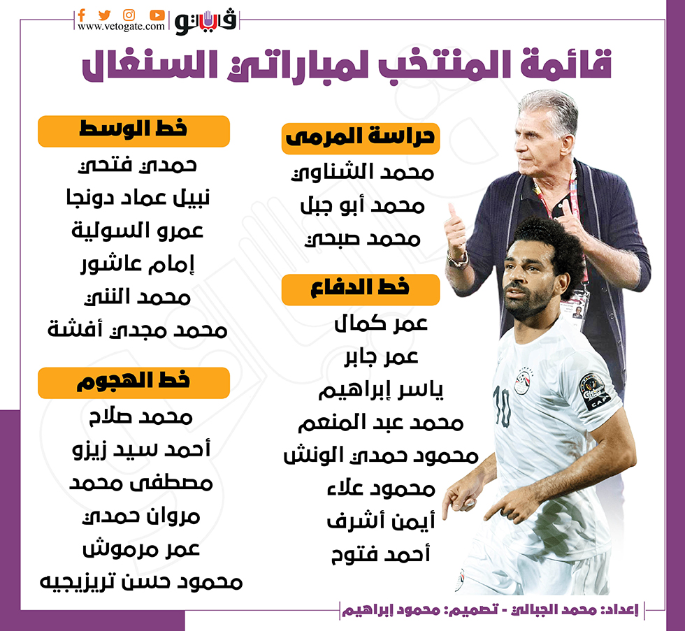 قائمة المنتخب لمباراتي مصر والسنغال | إنفوجراف السبت 19/مارس/2022 - 08:37 م 3/19/2022 8:37:01 PM قائمة المنتخب شارك طباعة 18 حجم الخط شارك طباعة