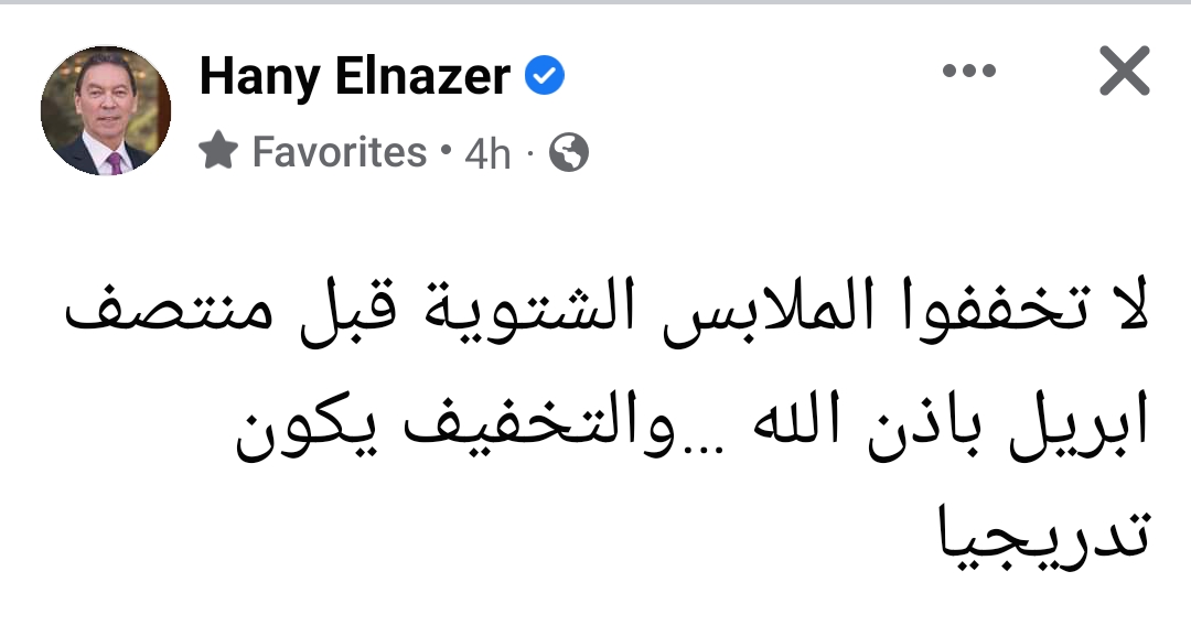 وكتب "الناظر" على صفحته الشخصية على موقع التواصل الاجتماعي "فيس بوك": "لا تخفِّفوا الملابس الشتوية قبل منتصف أبريل بإذن الله …والتخفيف يكون تدريجيًّا".