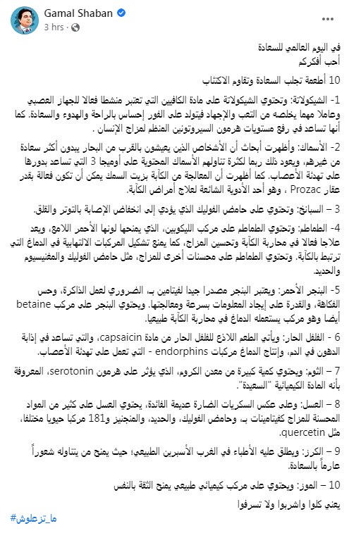وكتب جمال شعبان تدوينة على الفيس بوك "في اليوم العالمي للسعادة أحب أفكركم 10 أطعمة تجلب السعادة وتقاوم الاكتئاب 1- الشيكولاتة: وتحتوي الشيكولاتة على مادة الكافيين التي تعتبر منشطا فعالا للجهاز العصبي وعاملا مهما يخلصه من التعب والإجهاد فيتولد على الفور إحساس بالراحة والهدوء والسعادة. كما أنها تساعد في رفع مستويات هرمون السيروتونين المنظم لمزاج الإنسان."