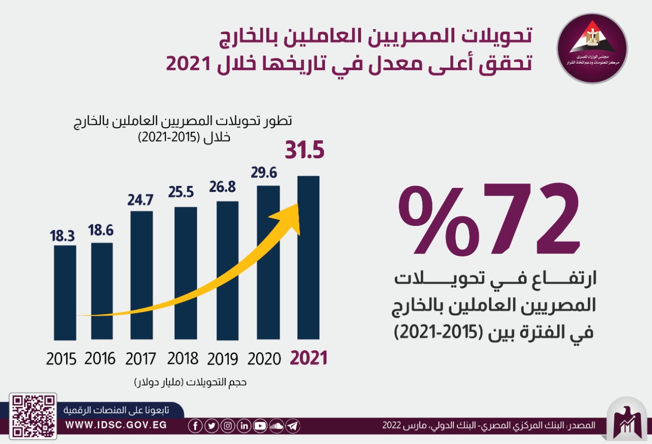 نشر مركز المعلومات ودعم اتخاذ القرار إنفوجرافيك جديدًا يستعرض تطورات تحويلات المصريين العاملين بالخارج خلال السنوات الأخيرة، والتي شهدت ارتفاعًا وصل إلى 72% في الفترة بين 2015 إلى 2021.