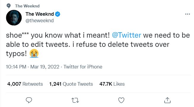 وقال المغني ذا ويكد عبر حسابه الرسمي علي موقع التغريدات القصيرة “تويتر”، “اضيفوا زر تعديل التغريدة.. لا أريد حذف تغريدة كاملة بسبب أخطاء مطبعية”.