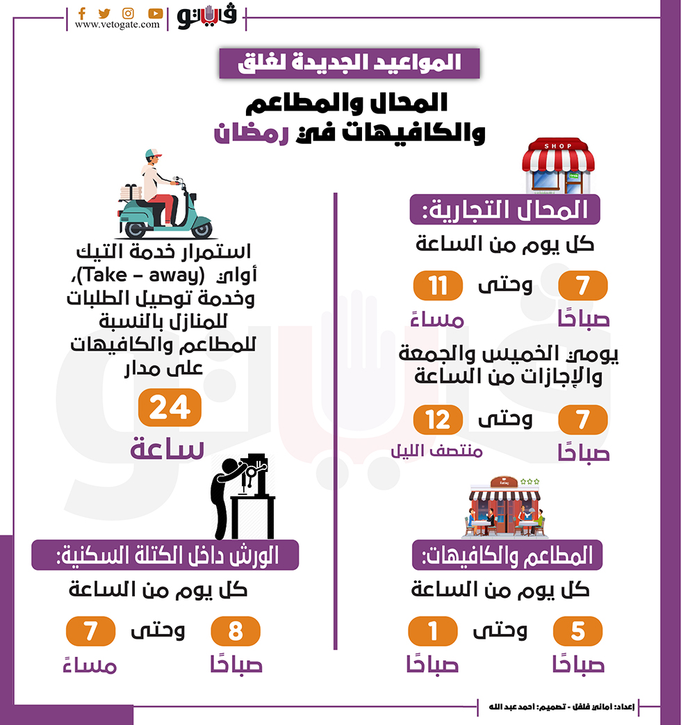 المواعيد الجديدة لغلق المحال والمطاعم والكافيهات في رمضان | إنفوجراف الأحد 20/مارس/2022 - 01:31 م 3/20/2022 1:31:06 PM مواعيد غلق المحال والمطاعم والكافيهات في رمضان أماني فلفل شارك طباعة 18 حجم الخط شارك طباعة تطبيق مواعيد غلق المحلات مواعيد غلق المحلات فى رمضان تطبيق مواعيد غلق المحلات والمولات