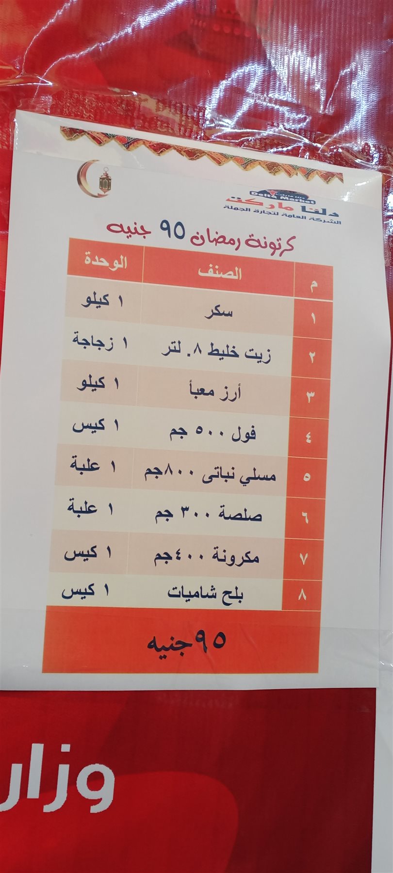 كما تضمن المعرض كراتين رمضان، يصل أسعارها 95 جنيها، وتحتوي علي كيلو سكر وكيلو أرز وزيت 8 لتر ونصف كيلو فول وعلبة سمن وعلبة صلصة وكيس مكرونة وكيس بلح.