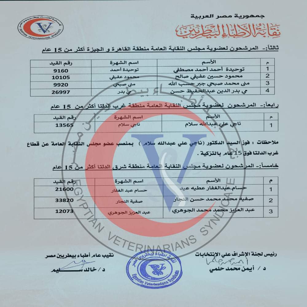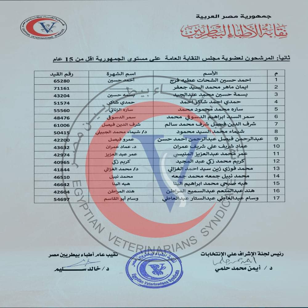 ويأتي ذلك بعد مراجعة لجنة الإشراف على انتخابات النقابة العامة للأطباء البيطريين جميع أوراق الأطباء البيطريين المتقدمين بطلبات للترشح، واستقبلت التظلمات والطعون والتنازلات، والنظر فيها بعد استطلاع رأى المستشارين المنتدبين للنقابة العامة، وبعد الرجوع لنصوص القانون واللائحة والأحكام القضائية المستقرة والفتاوى القانونية المستقرة.