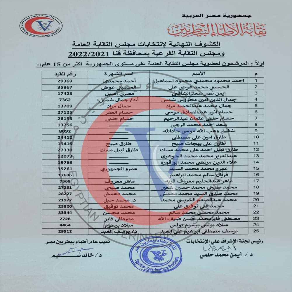 وتنشر «فيتو» كشوف المرشحين في انتخابات التجديد النصفي للنقابة العامة ونقابة قنا الفرعية والمقرر إقامتها يوم 30 مارس الجاري.