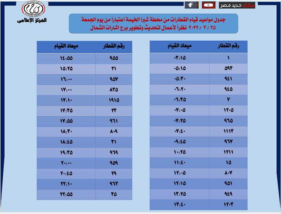 أعلنت الهيئة القومية لسكك حديد مصر اختصار وصول وقيام قطارات الوجه البحري (الروسي ذات التهوية الديناميكية - المختلطة - تحيا مصر) بمحطة شبرا الخيمة بصفة مؤقتة مع استمرار مسير القطارات المكيفة والقطارات المتجهة إلى الوجه القبلي إلى محطة القاهرة وذلك اعتبارًا من يوم الجمعة الموافق 25/3/2022.