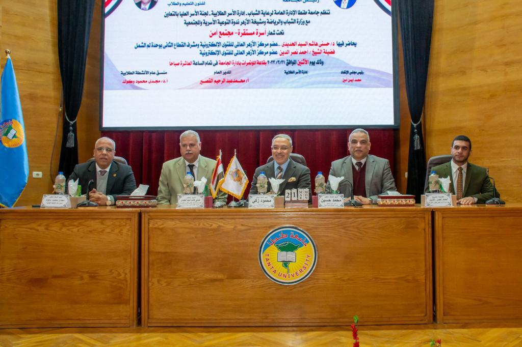 عقدت اليوم جامعة طنطا ندوة للتوعية الأسرية والمجتمعية بالتعاون مع مشيخة الأزهر ووزارة الشباب والرياضة تحت رعاية وبحضور الدكتور محمود ذكي رئيس الجامعة والدكتور محمد حسين نائب رئيس الجامعة لشئون التعليم والطلاب بعنوان "أسرة مستقرة = مجتمع آمن" والدكتور حسني هاشم الحديدي عضو مركز الأزهر العالمي للفتوى الإلكترونية ومشرف القطاع الثاني بوحدة لم الشمل، وفضيلة الشيخ أحمد نصر الدين عضو مركز الأزهر العالمي للفتوى الإلكترونية.