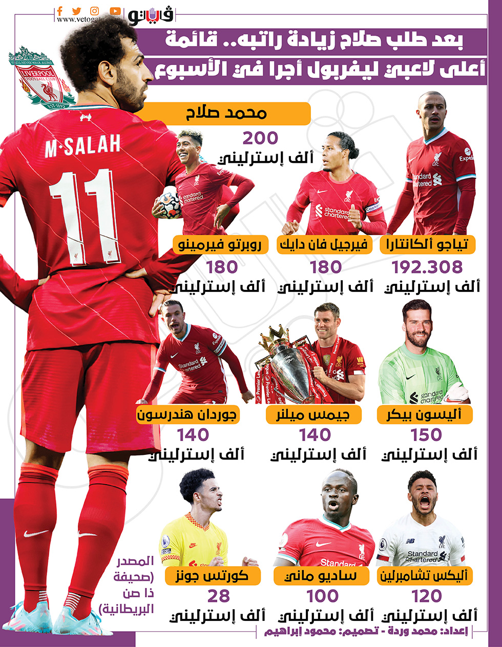 بعد طلب صلاح زيادة راتبه.. قائمة أعلى لاعبي ليفربول أجرا في الأسبوع | إنفوجراف الثلاثاء 22/مارس/2022 - 11:00 م 3/22/2022 11:00:56 PM ليفربول محمد وردة شارك طباعة 18 حجم الخط شارك طباعة ليفربول محمد صلاح تياجو ألكانتارا فيرجيل فان دايك روبرتو فيرمينيو
