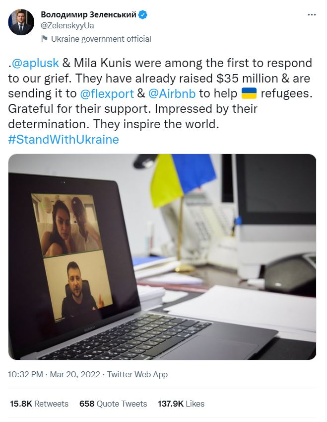 وشارك الرئيس الأوكراني فولوديمير زيلينسكي عبر حسابه الرسمي على موقع التغريدات القصيرة “تويتر”، لقطة لشاشة الكمبيوتر أثناء إجرائه مكالمة الفيديو مع أشتون كوتشر وميلا كونيس، وأرفقتها بتعليق قائلًا: "من بين أوائل الذين استجابوا لحزننا.. لقد جمعوا بالفعل 35 مليون دولار وأرسلوها إلى flexport &Airbnb لمساعدة اللاجئين.. ممتنون لدعمهم.. لقد ألهموا العالم…# قف مع أوكرانيا."