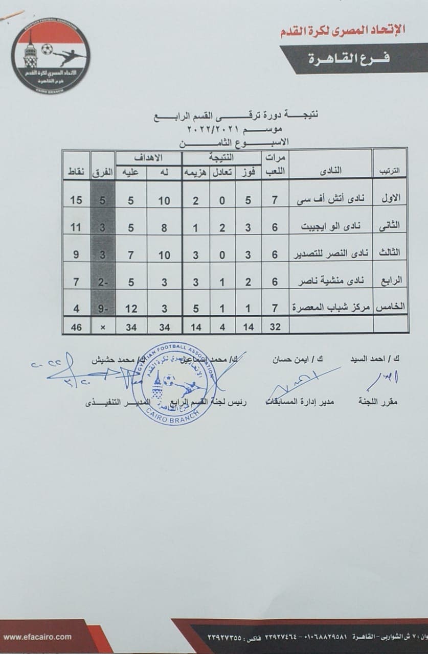 اعتمدت منطقة القاهرة لكرة القدم، جدول ترتيب التصفية النهائية لمسابقة دوري القسم الرابع بعد انتهاء الجولة الثامنة بمشاركة ٥ أندية.