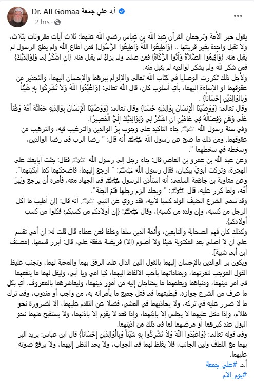 وكتب علي جمعة تدوينة على الفيس بوك "يقول حبر الأمة وترجمان القرآن عبد الله بن عباس رضي الله عنهما: ثلاث آيات مقرونات بثلاث، ولا تقبل واحدة بغير قرينتها.. {وَأَطِيعُوا اللَّهَ وَأَطِيعُوا الرَّسُول} فمن أطاع الله ولم يطع الرسول لم يقبل منه. {وَأَقِيمُوا الصَّلاَةَ وَآتُوا الزَّكَاةَ} فمن صلى ولم يزكِّ لم يقبل منه. {أَنِ اشْكُرْ لِي وَلِوَالِدَيْكَ} فمن شكر لله ولم يشكر لوالديه لم يقبل منه."