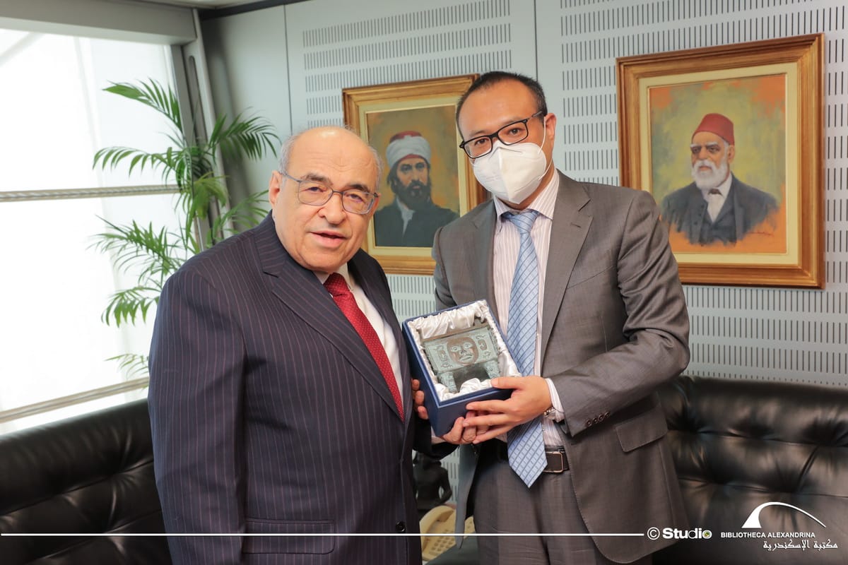 وأهدى الدكتور مصطفى الفقي المستشار الثقافي عددًا من مطبوعات مكتبة الإسكندرية، منها كتاب ذاكرة القاهرة الفوتوغرافية، وكتاب عن تاريخ حجر رشيد واكتشافه.