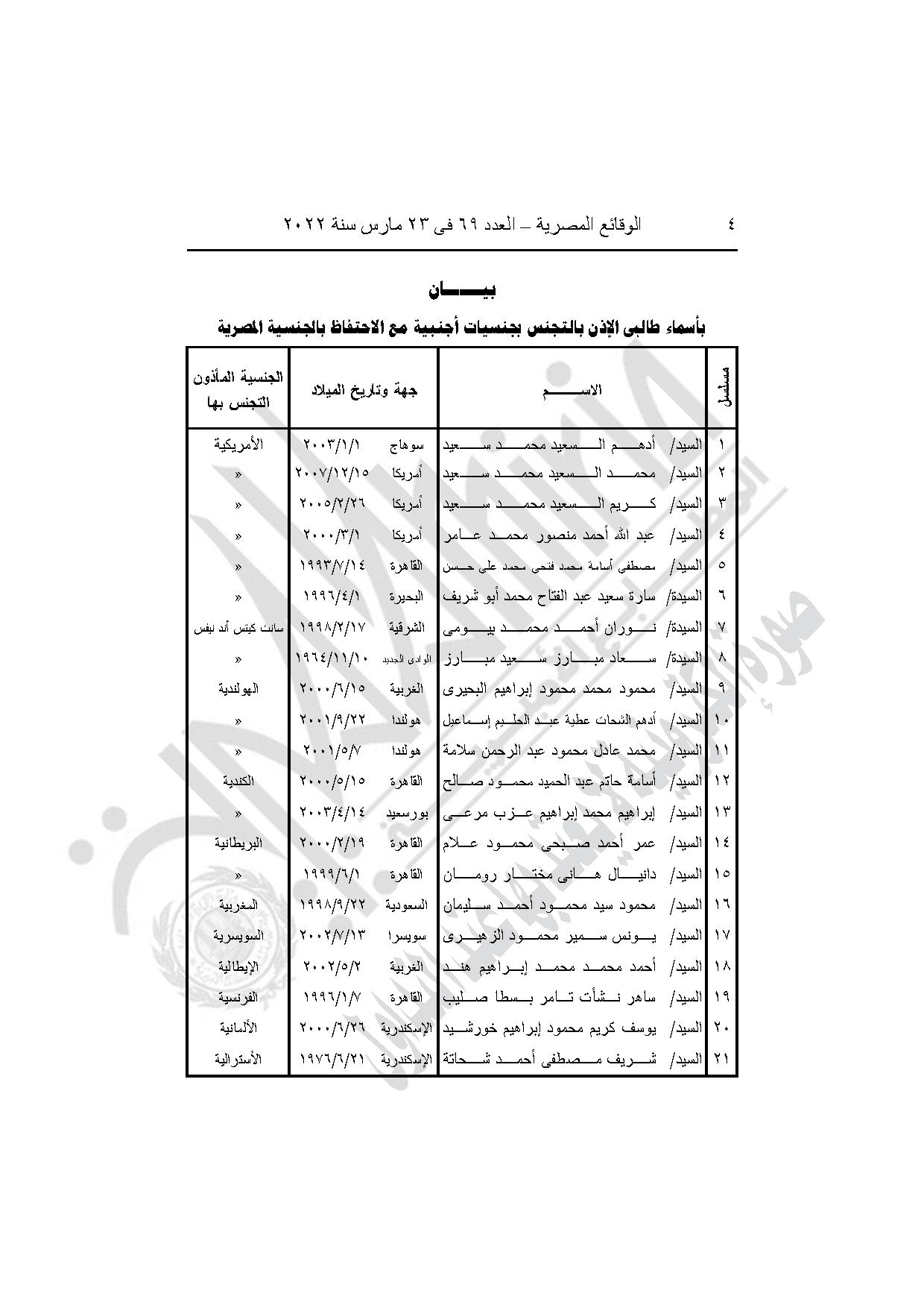 نشرت جريدة الوقائع المصرية، في عددها رقم 69، الصادر في 23 مارس 2022، قرارات وزارة الداخلية بسحب الجنسية من 21 مواطنًا، والأذن لـ21 مواطنًا للتجنس بالجنسية الأجنبية مع الاحتفاظ بالجنسية المصرية.
