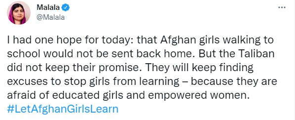 وكتبت ملالا يوسف زاي تغريدة على تويتر "لدي أمل واحد اليوم: أن يذهب الفتيات الأفغانيات للمدرسة، وألا يعودوا للبيت مرة أخرى. لكن طالبان لا يوفون بوعودهم. سيجدون الأعذار لوقف تعليم الفتيات- لأنهم يخافون من الفتيات المتعلمات والسيدات العاملات #دعوا الفتيات الأفغانيات يتعلمن"
