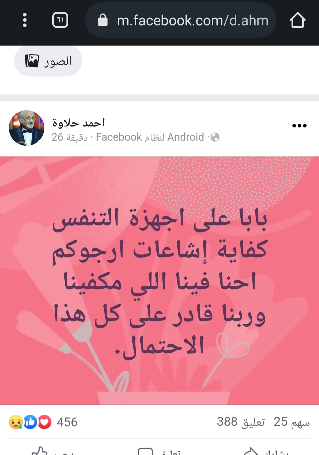 وكتبت "هبة" عبر حساب والدها الرسمي بموقع التواصل الاجتماعي «فيس بوك» “بابا على أجهزة التنفس الصناعي، كفاية إشاعات أرجوكم، إحنا فينا اللي مكفينا، وربنا قادر على كل شيء”.