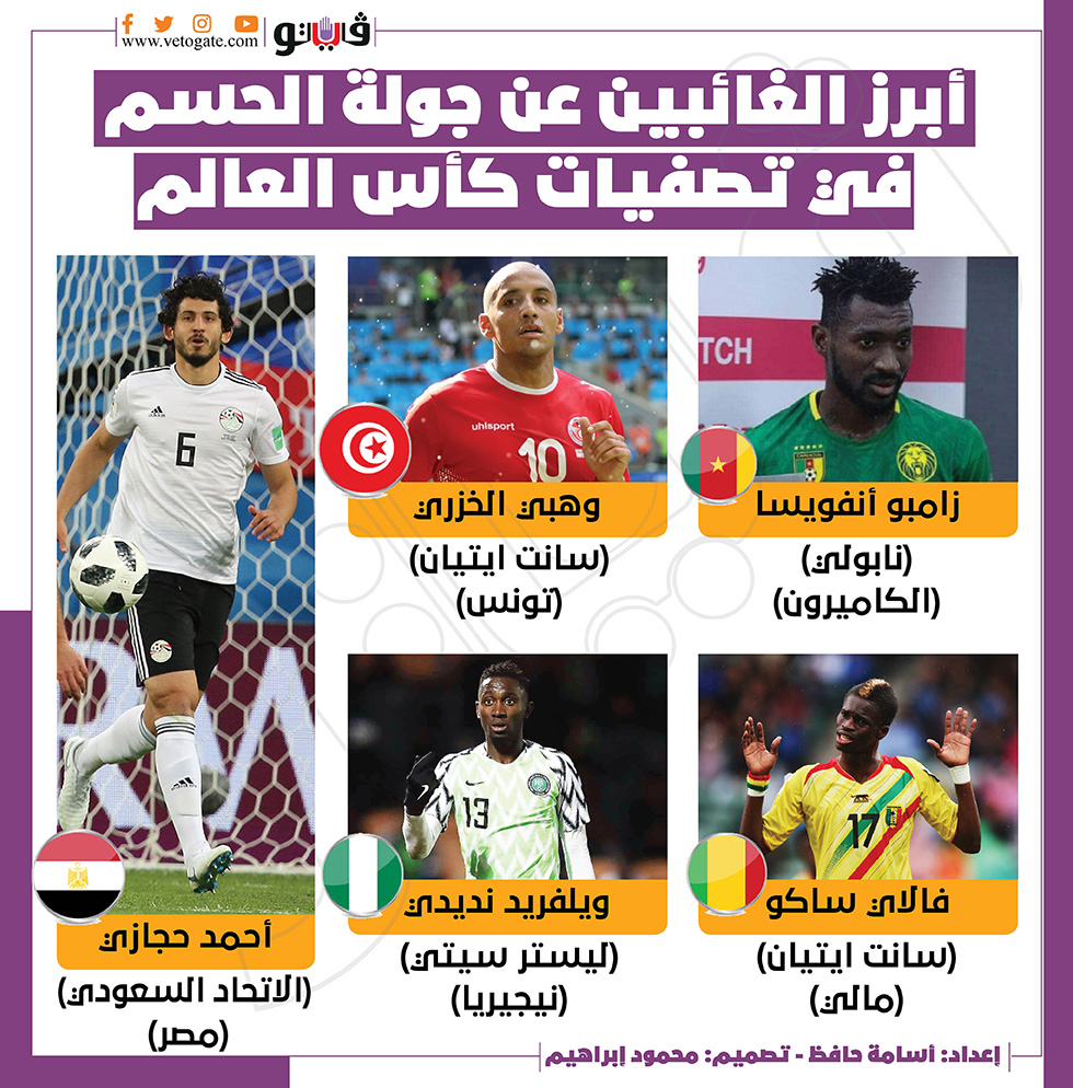 أبرز الغائبين عن جولة الحسم في تصفيات كأس العالم | انفوجراف الخميس 24/مارس/2022 - 04:41 م 3/24/2022 4:41:05 PM حجازي اسامة حافظ شارك طباعة 18 حجم الخط شارك طباعة تونس نابولي تصفيات كأس العالم أحمد حجازي صفيات كأس العالم