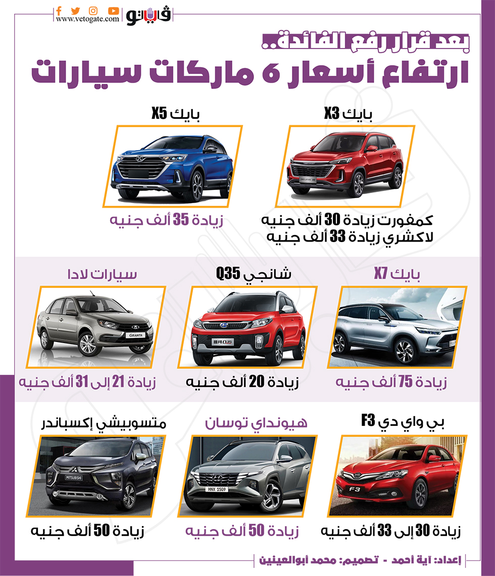 بعد قرار رفع الفائدة.. ارتفاع أسعار 6 ماركات سيارات|انفوجراف الخميس 24/مارس/2022 - 06:12 م 3/24/2022 6:12:30 PM سيارات آية أحمد شارك طباعة 18 حجم الخط شارك طباعة السيارات اسعار السيارات سيارات سوق السيارات هيونداي