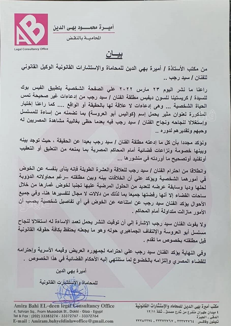 وجاء البيان كالتالي: راعنا ما نشر اليوم على الصفحة الشخصية على فيسبوك للسيدة كريتستينا نلسون ديفيس، مطلقة الفنان سيد رجب، من ادعاءات غير صحيحة، تمس الحياة الشخصية.. وهي ادعاءات لا علاقة لها بالحقيقة أو الواقع، كما راعنا اختيار المذكورة لعنوان مثير يحمل اسم: كواليس أبو العروسة.. بما تضمنه من إساءة للمسلسل، واستغلالا لنجاحه، ونجاح الفنان سيد رجب فيه؛ بعدما حظي بغالبية مشاهدة المصريين له وحبهم وتقديرهم لدوره.