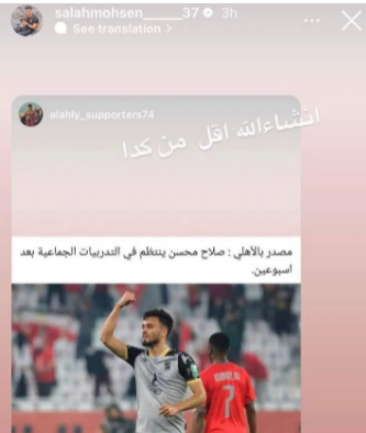 نشر صلاح محسن لاعب النادي الأهلي، خلال القصص المصورة "ستوري" عبر حسابه على موقع التواصل الاجتماعي" انستجرام " موعد عودته للمشاركة في التدريبات الجماعية للفريق الأحمر، والتي غاب عنها منذ فترة بسبب الإصابة.