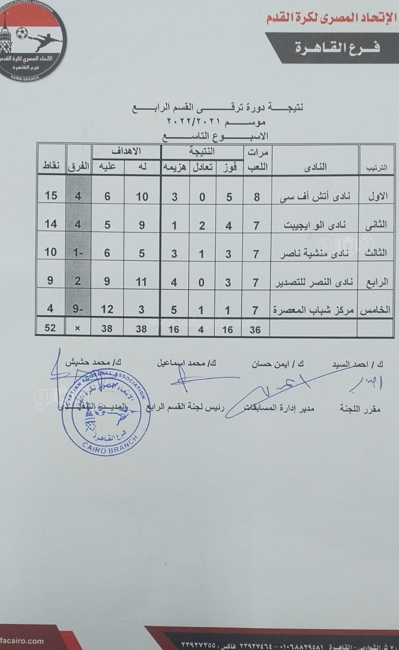 اعتمدت منطقة القاهرة لكرة القدم، جدول ترتيب التصفية النهائية لمسابقة دوري القسم الرابع بعد انتهاء الجولة التاسعة بمشاركة ٥ أندية.