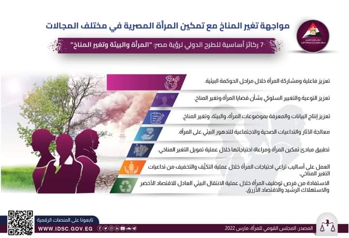 وهو ما تم إيضاحه خلال الطرح الدولي لرؤية جمهورية مصر العربية لموضوع المرأة والبيئة وتغير المناخ خلال الجلسة الافتتاحية للدورة ٦٦ للجنة وضع المرأة بالأمم المتحدة، والذي يرتكز على ٧ ركائز أساسية.