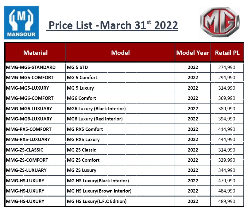 الأسعار الجديدة لسيارات MG