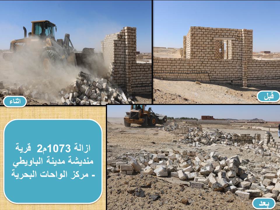وتابع محافظ الجيزة مجهودات مركز الواحات البحرية عرؤ لا ؤلاعاوبالتعاون مع قسم شرطة الواحات البحرية بتنفيذ 15 قرار إزالة تعدى على الأراضي بقرية منديشة ومنطقة جنوب منطقة الدائري حيث شملت الحملة إزالة اسوار ومخالفات بناء من بلوك الحجر الجيري بارتفاعات مختلفة بالإضافة الي إزالة غُرف غير مسقوفة واخري غير مكتملة البناء بمساحة اجمالية 19013م2 مع اتخاذ كافة الإجراءات القانونية حيال المخالفين وذلك بمتابعه من الدكتور صبري شاكر رئيس مركز الواحات البحرية.