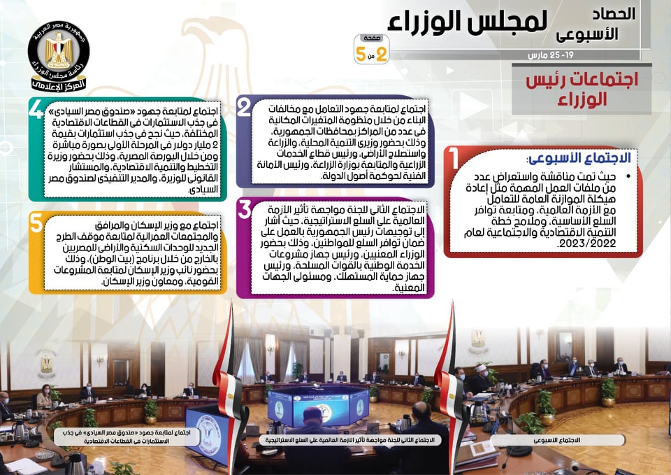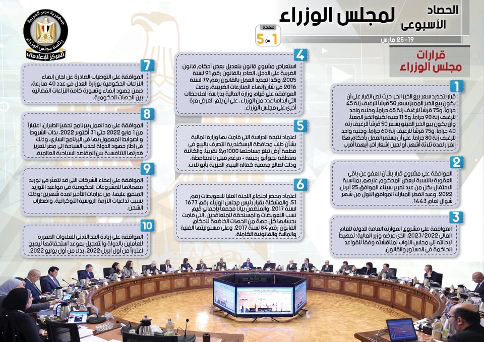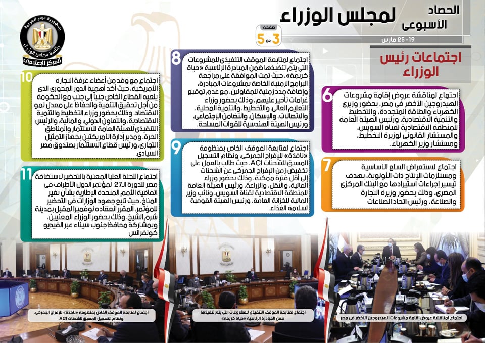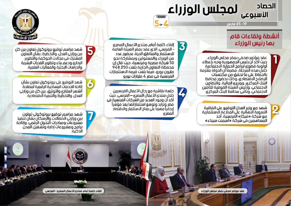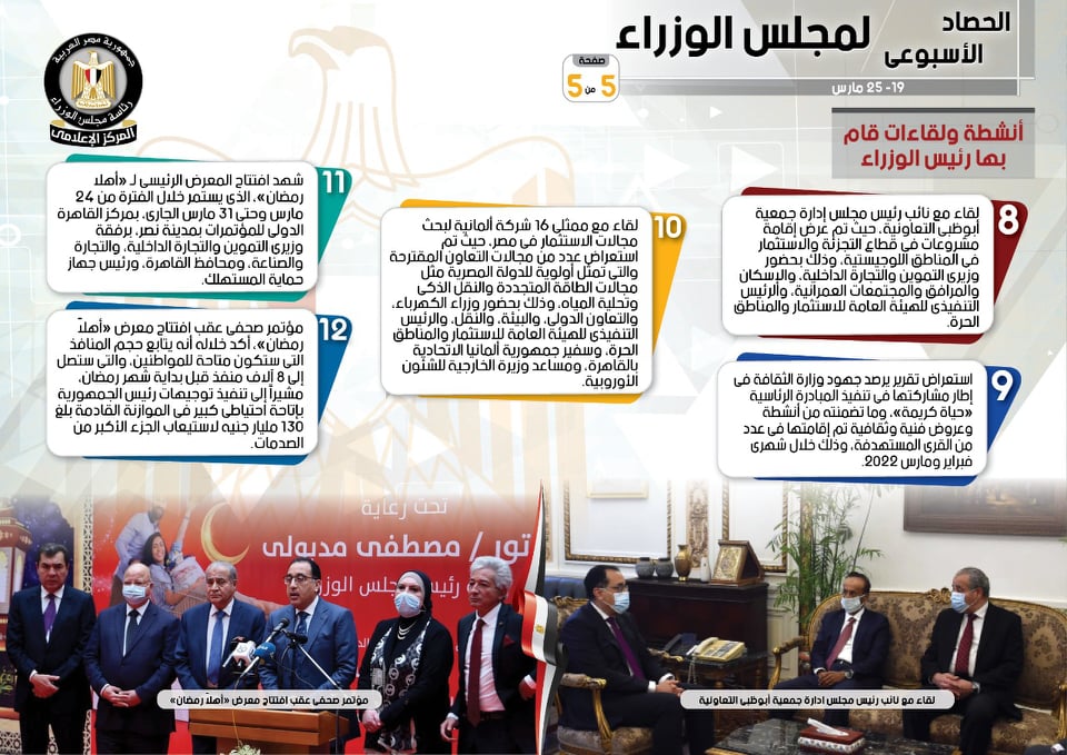 نشر المركز الإعلامي لمجلس الوزراء، تقريرًا شمل إنفوجرافات سلط من خلالها الضوء على الحصاد الأسبوعي لمجلس الوزراء، وذلك خلال الفترة من 19 حتى 25 مارس 2022، والذي تضمن الموافقة على عدد من القرارات، فضلًا عن الاجتماعات واللقاءات التي عقدها الدكتور مصطفى مدبولي، رئيس مجلس الوزراء، بالإضافة إلى ما قام به من أنشطة.