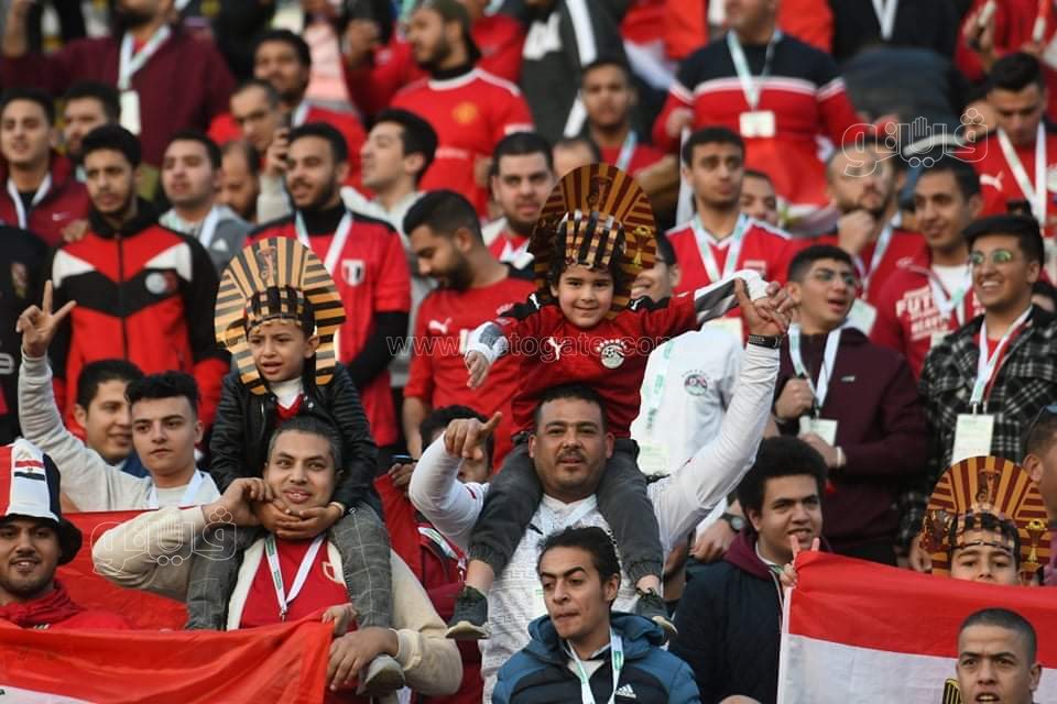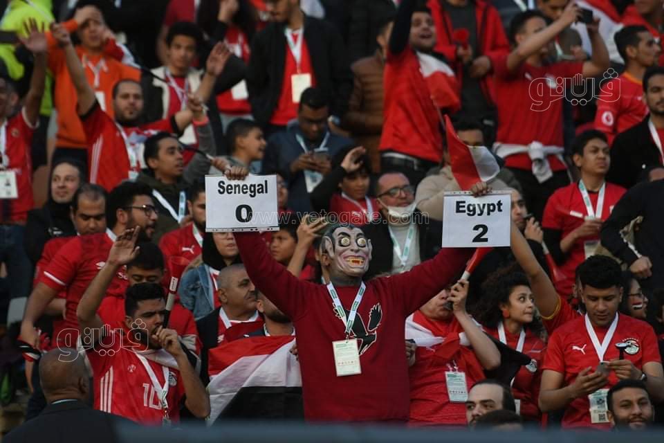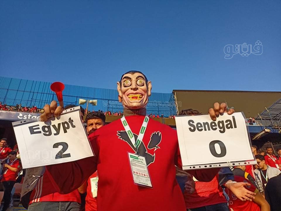 وحرص أحد الجمهور علي ارتداء قناع العفريت ورفع لافتات توقع نتيجة المباراة بفوز مصر ٢/ ٠ على السنغال، فيما ارتدي آخرون الزي الفرعوني أو زي علم مصر.