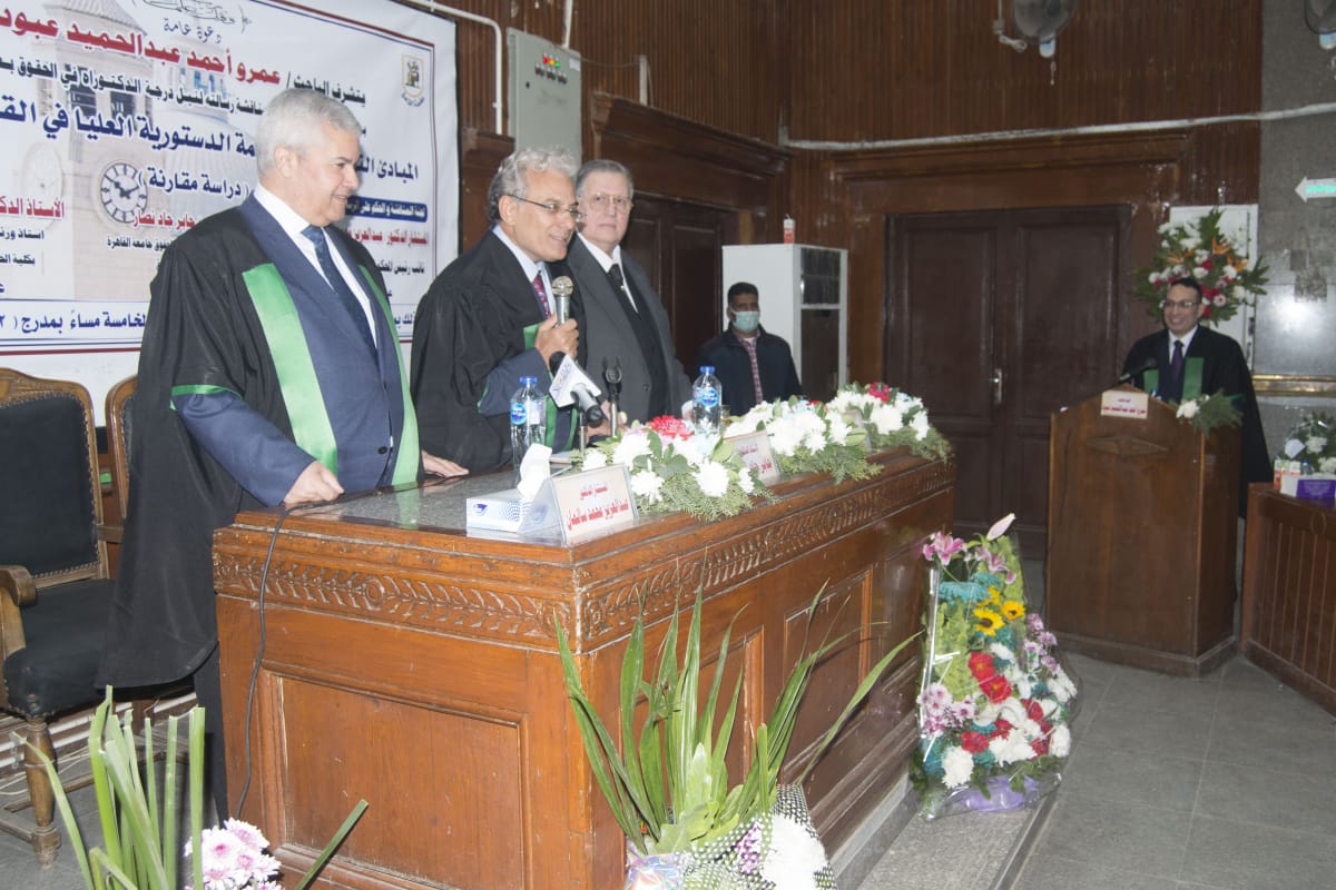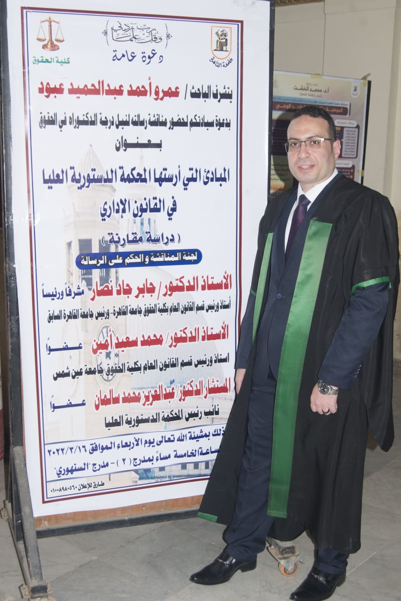 ناقشت كلية الحقوق جامعة القاهرة رسالة دكتوراه عن "المبادئ التى أرستها المحكمة الدستورية العليا فى القانون الإداري – دراسة مقارنة" مقدمة من الباحث المستشار عمرو أحمد عبود وكيل مجلس الدولة.