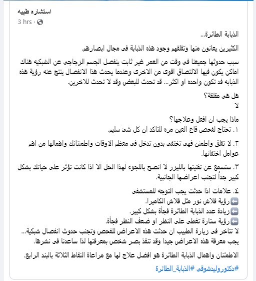 وأضاف "لا تتأخر فى زيارة الطبيب ان حدثت هذه الأعراض للفحص وتجنب حدوث انفصال شبكية... يجب معرفة هذه الأعراض جيدا وقد تنقذ بصر شخص بمعرفتها لذا ساعدنا فى نشرها. الاطمئنان وإهمال الذبابة الطائرة هو افضل علاج لها مع مراعاة النقاط الثلاثة بالبند الرابع"