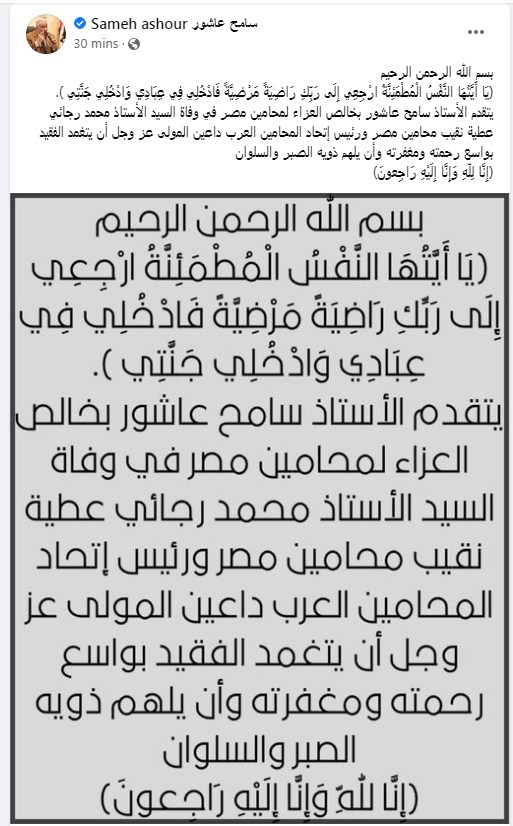 وأضاف في نعيه عبر صفحته الرسمية بالفيس بوك "يتقدم الأستاذ سامح عاشور بخالص العزاء لمحامين مصر في وفاة السيد الأستاذ محمد رجائي عطية نقيب محامين مصر ورئيس إتحاد المحامين العرب داعين المولى عز وجل أن يتغمد الفقيد بواسع رحمته ومغفرته وأن يلهم ذويه الصبر والسلوان (إِنَّا لِلّهِ وَإِنَّا إِلَيْهِ رَاجِعونَ)