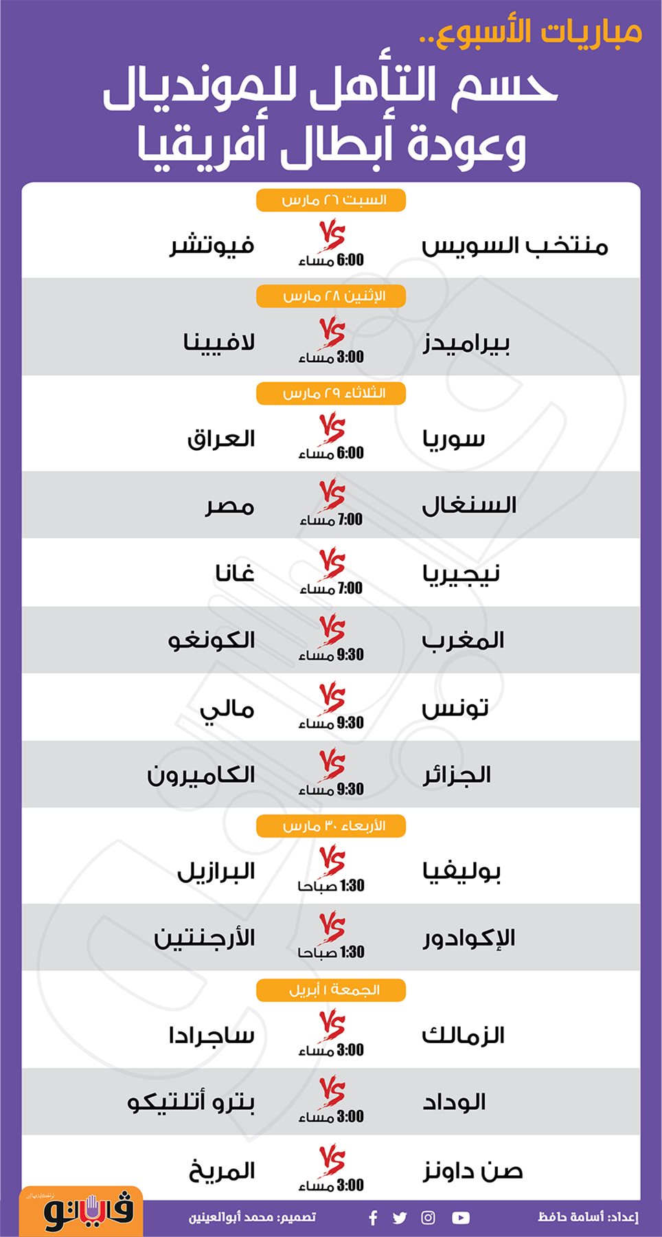 مباريات الأسبوع.. حسم التأهل للمونديال وعودة أبطال أفريقيا| انفوجراف السبت 26/مارس/2022 - 04:53 م 3/26/2022 4:53:08 PM مباريات الاسبوع اسامة حافظ شارك طباعة 18 حجم الخط شارك طباعة الجزائر بيراميدز مصر مباريات الاسبوع