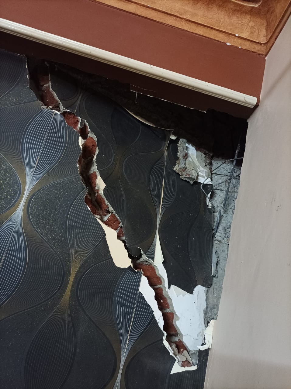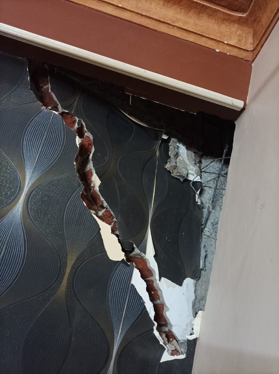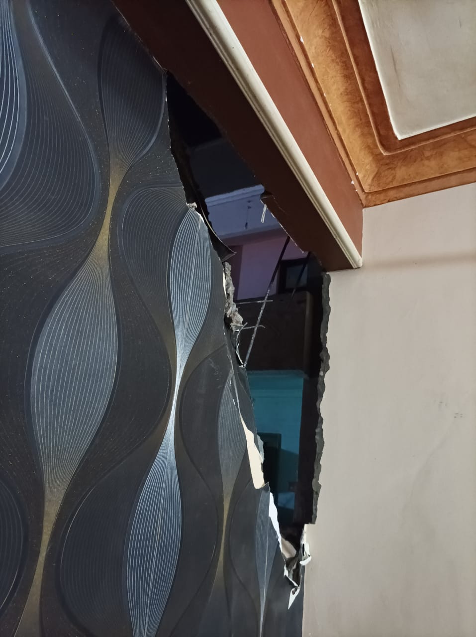 وتبين أن المنزل مبنى بالمسلح ومكون من ٥ طوابق ويقطنه ٣٠ فردا ومأهول بالسكان وتبين انهيار الجزء الجانبي للمنزل دون حدوث إصابات بسبب قيام أحد الجبران بالهدم.