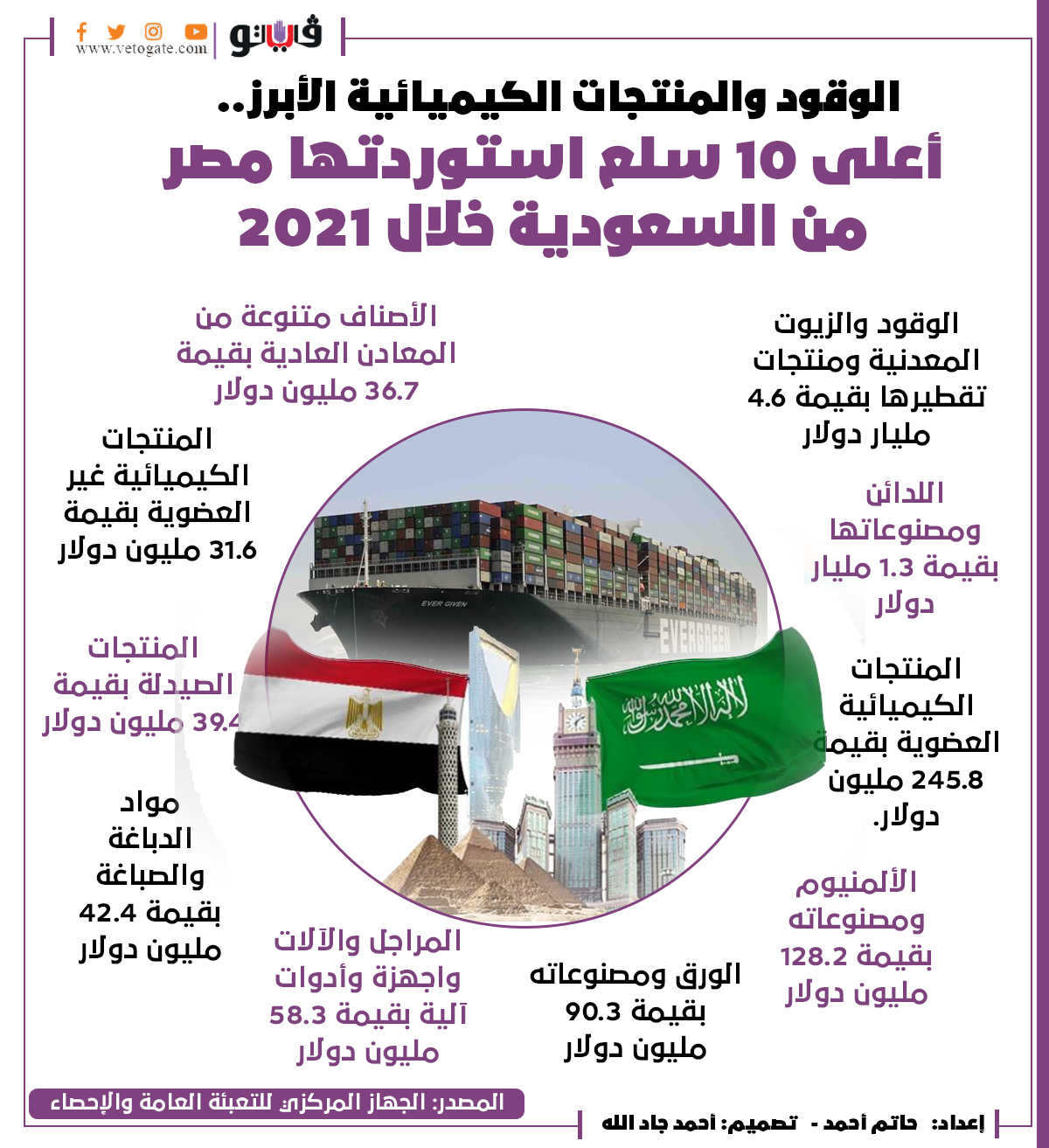 الوقود والمنتجات الكيميائية الأبرز.. أعلى 10 سلع استوردتها مصر من السعودية خلال 2021|انفوجراف السبت 26/مارس/2022 - 11:30 م 3/26/2022 11:30:54 PM السلع المستوردة حاتم أحمد شارك طباعة 18 حجم الخط شارك طباعة الصادرات السعودية الوقود والزيوت المعدنية المنتجات الكيميائية العضوية الجهاز المركزى للتعبئة العامة والإحصاء مواد الدباغة والصباغة