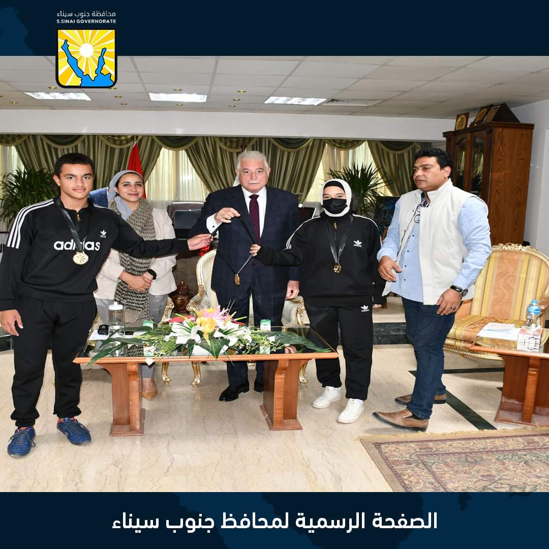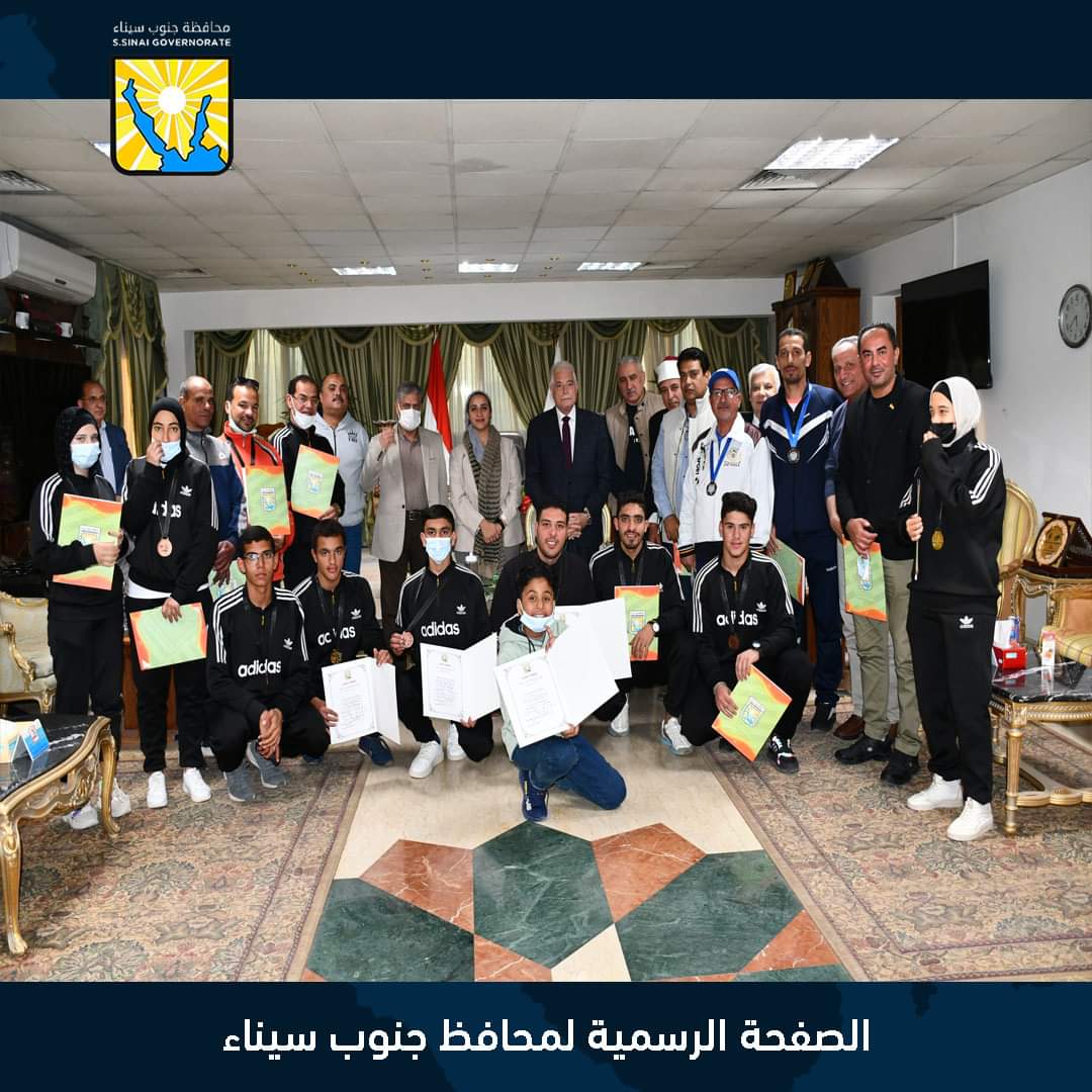كرم اللواء خالد فودة محافظ جنوب سيناء مساء اليوم السبت، بمكتب المحافظ بمدينة شرم الشيخ، بحضور الدكتورة إيناس سمير نائب المحافظ، واللواء أيمن الشريف السكرتير العام، ومحمد فتحي وكيل وزارة الشباب والرياضة بالمحافظة، أبطال جنوب سيناء المتميزين رياضيًّا من اللاعبين والمدربين والمشرفين المتميزين، خلال مشاركتهم في أوليمبياد المحافظات الحدودية في نسختها الثالثة والتي أقيمت بمحافظة أسوان فبراير ٢٠٢٢.