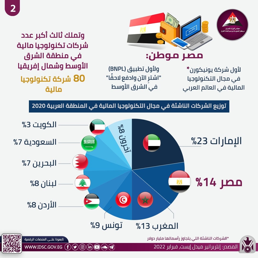 نشر مركز المعلومات ودعم اتخاذ القرار بمجلس الوزراء المصري إنفوجرافيك جديدًا بعنوان "مصر تملك سوق تكنولوجيا مالية واعدة والأكثر جاذبية وربحًا في الشرق الأوسط وشمال إفريقيا" يرصد فيه وضع مصر في مجال التكنولوجيا المالية على مستوى دول الشرق الأوسط وشمال إفريقيا.