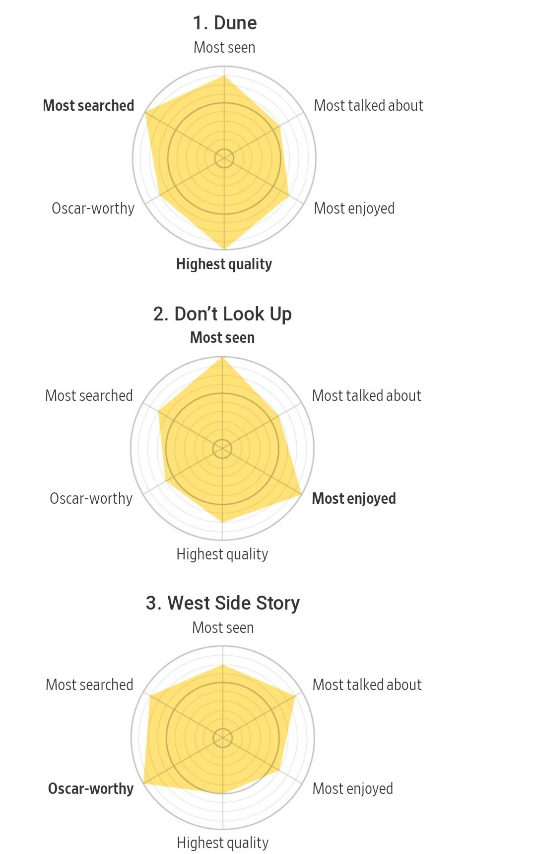 وجاء بعده في عدد الترشيحات أفلام "Dune" و"Belfast" وfictionalized glimpse و"West Side Story"و"Don’t Look Up" و"King Richard" و"CODA" و"Licorice Pizza" و"Drive My Car" و"Nightmare Alley"، وأفلام أخرى.
