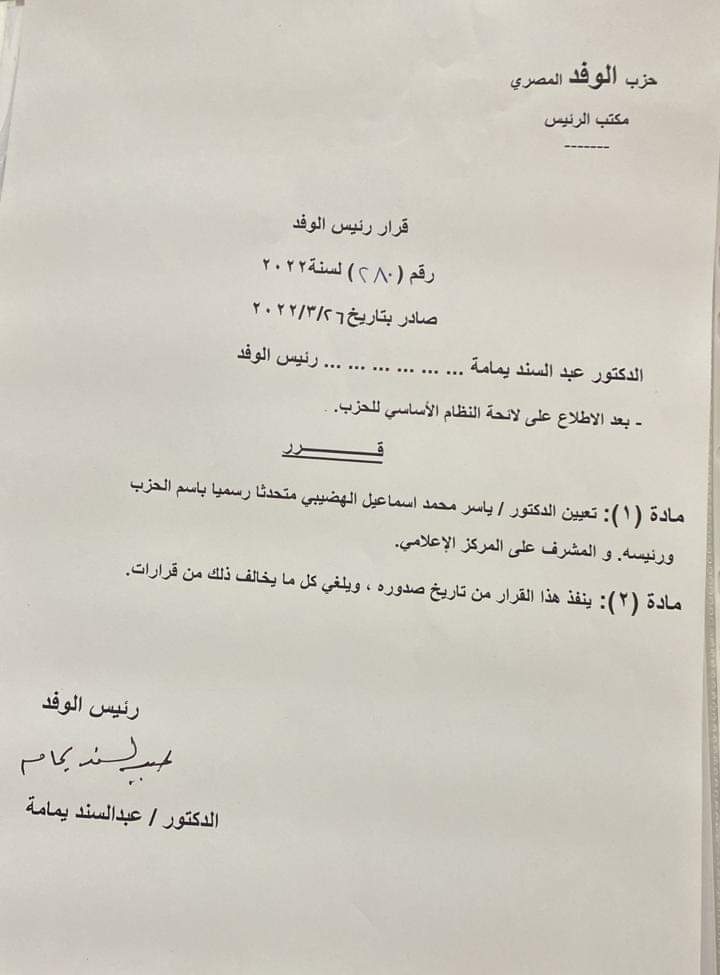 قرر الدكتور عبد السند يمامة رئيس حزب الوفد، تعيين الدكتور ياسر الهضيبى متحدثا رسميا باسم حزب الوفد، ومشرفا على المركز الإعلامى للحزب.