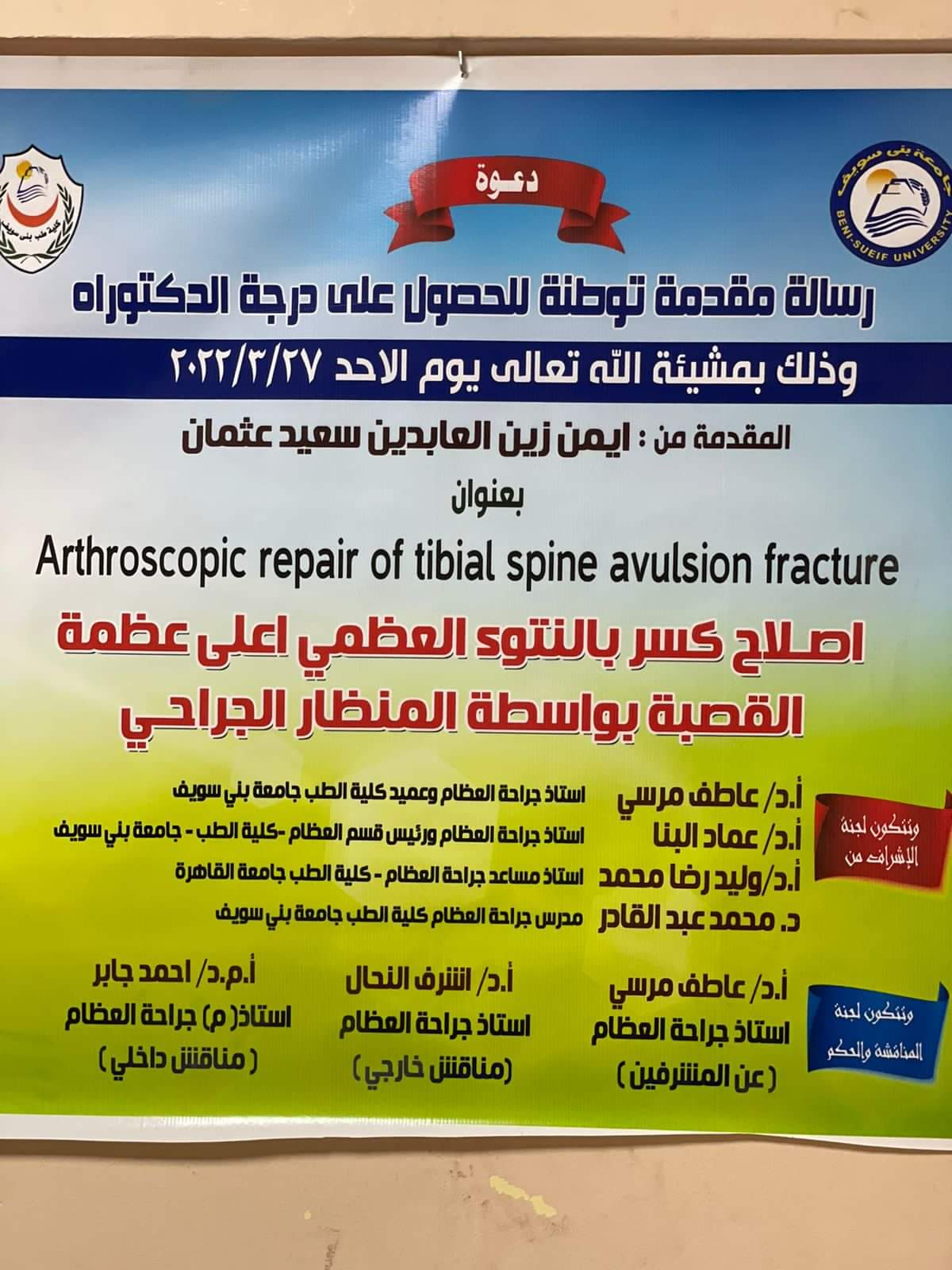 وناقش الرسالة كل من أ.د عاطف مرسي أستاذ جراحة العظام وعميد كلية الطب جامعة بني سويف، أ.د عماد البنا أستاذ جراحة العظام ورئيس قسم العظام في كلية الطب بجامعة بني سويف، أ.د وليد رضا محمد أستاذ مساعد جراحة العظام في كلية الطب بجامعة القاهرة، ودكتور محمد عبد القادر مدرس جراحة العظام في كلية الطب بجامعة بني سويف.