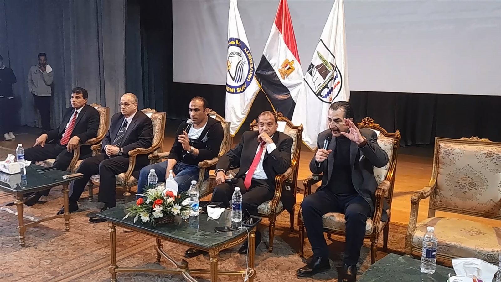 وكان الدكتور منصور حسن، رئيس جامعة بني سويف، استقبل، صباح اليوم، سيد عبد الحفيظ مدير الكرة بالنادي الأهلي والكاتب الصحفي عصام شلتوت، في حضور الدكتور جمال عبد الرحمن نائب رئيس الجامعة لشؤون التعليم والطلاب، والنائب سامي توفيق عضو مجلس النواب ورئيس نادي بنى سويف الرياضى، والكابتن محمد فاروق مدير الإدارة العامة لرعاية الشباب، وعضو لجنة الحكام الرئيسية، والكابتن توني عثمان عضو لجنة الحكام الرئيسية، وصلاح بدر رئيس منطقة بنى سويف لكرة القدم، وعدد من الرياضيين والإعلاميين والصحفيين، وعمداء الكليات وأعضاء هيئة التدريس والطلاب.