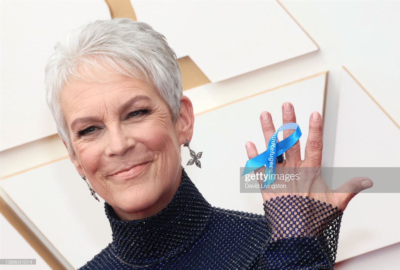 أظهرت الممثلة المخضرمة جايمي لي كيرتس دعمها للاجئين الأوكرانيين على السجادة الحمراء لحفل توزيع جوائز الأوسكار 2022، عبر ارتدائها شارة زرقاء اللون على يديها.
