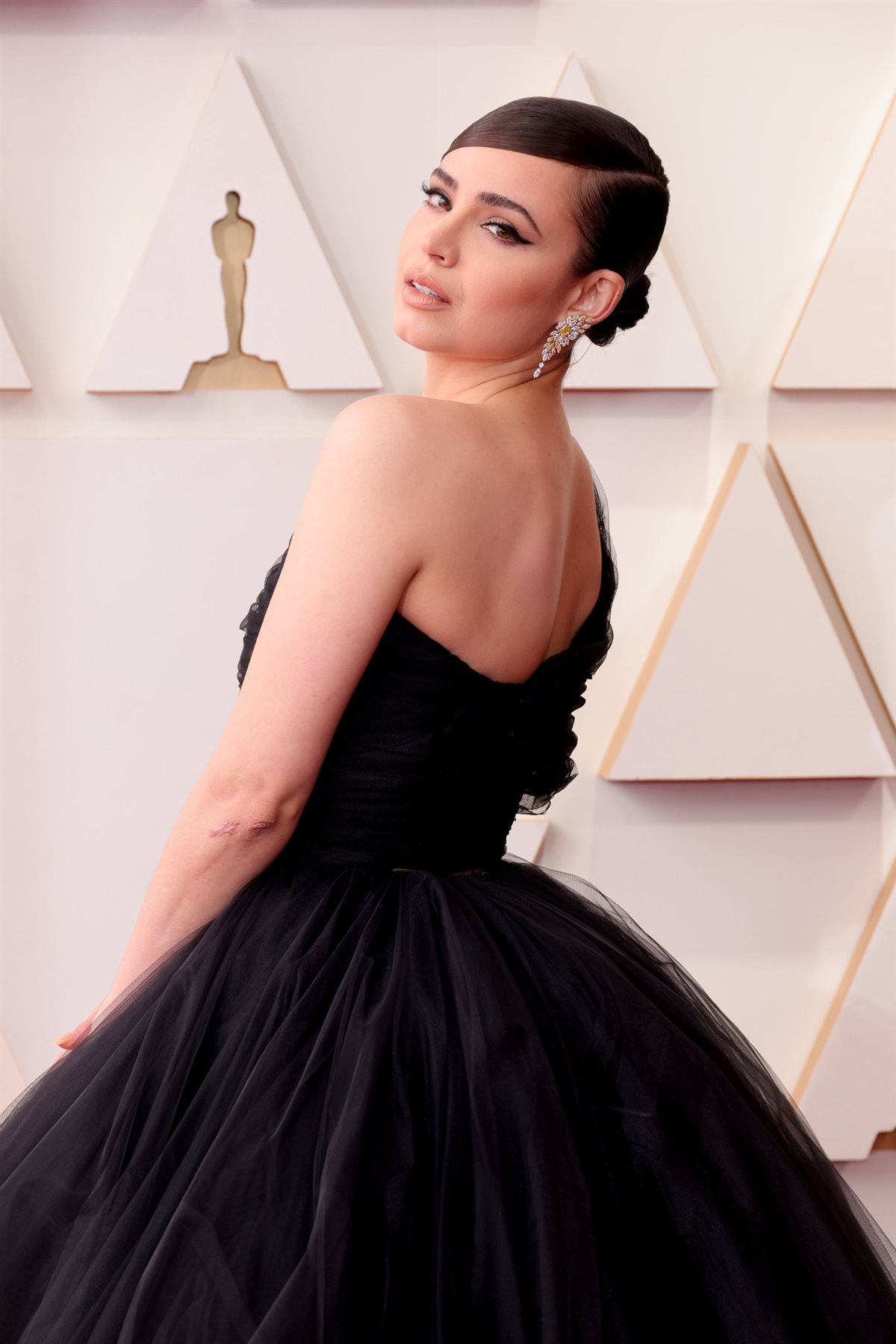 تألقت الممثلة الشابة صوفيا كارسون 28 عاما على السجادة الحمراء لحفل توزيع جوائز الأوسكار 2022، عبر ارتدائها فستانا أسود بسيطا أظهر جمال بشرتها ونقائها، كما اختارت تسريحة شعر ناعمة.
